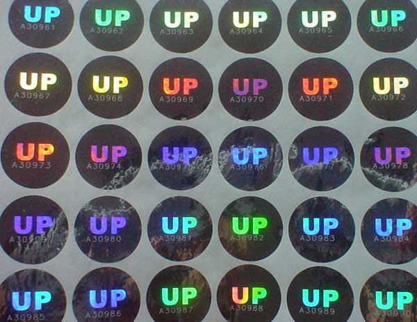 color, one layer. The UP image is one color. There's transparent laser engraved serial numbers. This Hologram Label is very shining because 2D hologram make the most shiningness.