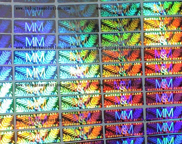 This Hologram Label is 2D/3D hologram effect, two layers with viewing depth, three color seperation. The logo of 'MM' and '&' is two angle flips on surface with small text. One color leaf image is in background deeply. Although this leaf is only one color, it's very shining because the photo contrast is very good.