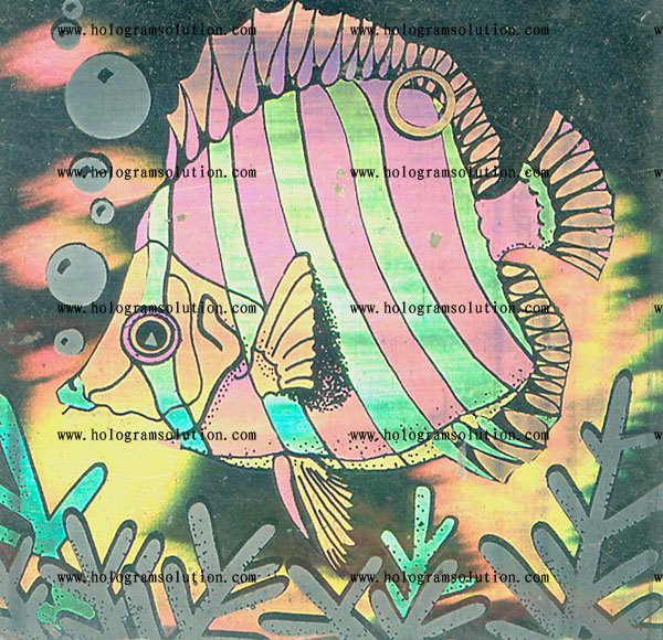 This Hologram Label show a fish swimming through coral tree. It's 7 color design, 2D/3D hologram, with good viewing depth.