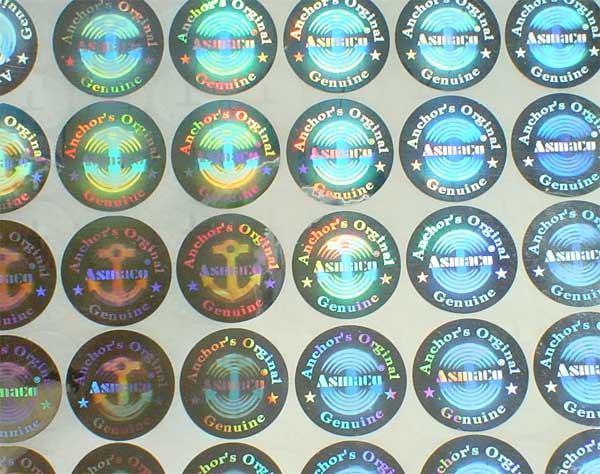 This is Hologram Label with flip-flop effect. The anchor hologram image and hologram company logo is two flips. One image evolves into aother image when viewing angle changes. So you'll see anchor image in one viewing angle and see company logo in another viewing angle.
