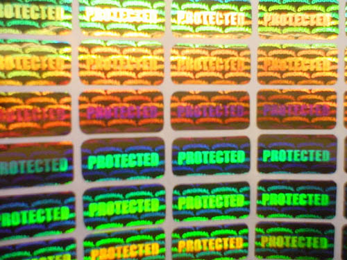 This sticker is 2D/3D hologram, two layers, two color in foreground, two color in background. It's general design. There's word "PROTECTED" on surface and word "VOID" on the second layer. Around word "PROTECTED" is rainbow hologram effect which is very shining.