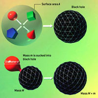 But it is another aspect of the holographic bound that is truly astonishing. Namely, that the maximum possible entropy depends on the boundary area instead of the volume. Imagine that we are piling up computer memory chips in a big heap. The number of transistors--the total data storage capacity--increases with the volume of the heap. So, too, does the total thermodynamic entropy of all the chips. Remarkably, though, the theoretical ultimate information capacity of the space occupied by the heap increases only with the surface area. Because volume increases more rapidly than surface area, at some point the entropy of all the chips would exceed the holographic bound. It would seem that either the GSL or our commonsense ideas of entropy and information capacity must fail. In fact, what fails is the pile itself: it would collapse under its own gravity and form a black hole before that impasse was reached. Thereafter each additional memory chip would increase the mass and surface area of the black hole in a way that would continue to preserve the GSL.