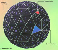 Hawking's radiation process allowed him to determine the proportionality constant between black hole entropy and horizon area: black hole entropy is precisely one quarter of the event horizon's area measured in Planck areas. (The Planck length, about 10-33 centimeter, is the fundamental length scale related to gravity and quantum mechanics. The Planck area is its square.) Even in thermodynamic terms, this is a vast quantity of entropy. The entropy of a black hole one centimeter in diameter would be about 1066 bits, roughly equal to the thermodynamic entropy of a cube of water 10 billion kilometers on a side.