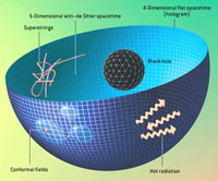 The holographic equivalence can allow a difficult calculation in the 4-D boundary spacetime, such as the behavior of quarks and gluons, to be traded for another, easier calculation in the highly symmetric, 5-D anti-de Sitter spacetime. The correspondence works the other way, too. Witten has shown that a black hole in anti-de Sitter spacetime corresponds to hot radiation in the alternative physics operating on the bounding spacetime. The entropy of the hole--a deeply mysterious concept--equals the radiation's entropy, which is quite mundane.